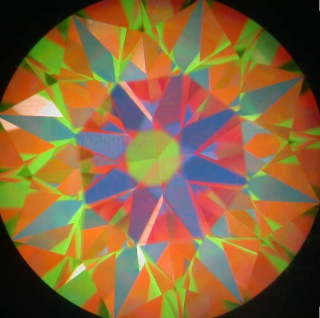 When viewing an ASET image, one of the first things you will notice is there are three main colors: red, green, and blue. The red color represents the brightest light return in a diamond from a direct light source while green demonstrates light return from an indirect light source. This means the red and green colors demonstrate a diamond’s fire and brilliance. The most telling part of an ASET image, though, is provided by the blue colors. Blue is showing the diamond’s internal patterns, and therefore explains the quality of the diamond’s cut. A higher quality diamond cut will provide symmetrical blue coloring. On the other hand, diamonds with poor cut quality will have clustered areas of blue.